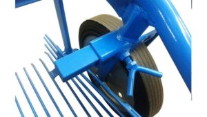 The angle of the pan is adjustable, allowing for a maximum penetration of 6” below the level of the two support wheels, which are 14” in diameter and can straddle hill widths ranging from 20” to 30”.