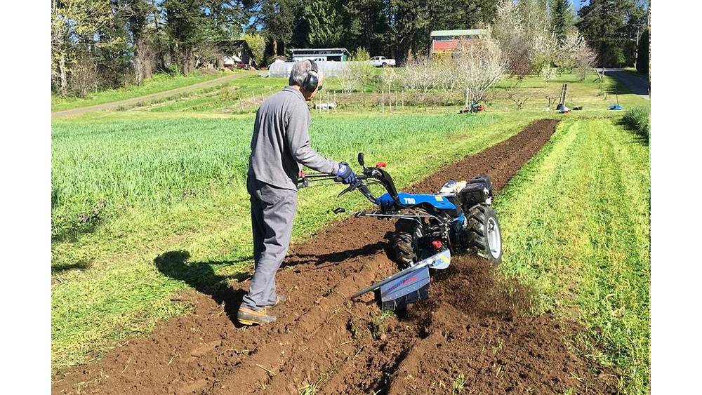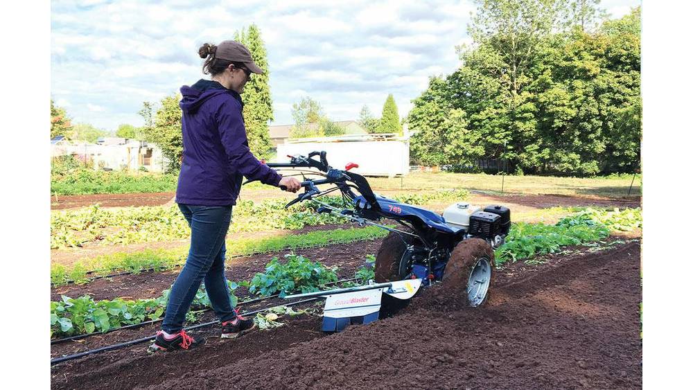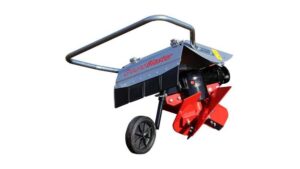 Four spiral blades spin at 245 RPM on a vertical shaft, digging effortlessly into all types of soil — including hardened, rock-filled dirt that has yet to be broken. Debris is discharged to the right side, allowing the operator to build raised beds with multiple passes.