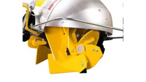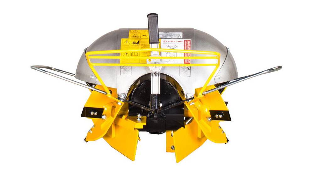 The Swivel Rotary Plow works similarly to the Rotary Plow, but instead of one plowshare throwing soil to the right, the Swivel Plow has a second plowshare that can be set for left soil discharge. At the end of each pass, a lever on the rear of the attachment allows for easy changing between the two plowshares.