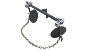 The Bed Shaper consists of two disc hillers, clamps, and a drag chain fastened to a 1-meter (39.37”) Straight Bar. The hillers can be adjusted to any position on the straight bar. When turned inward and set closer than 30”, the height of the bed can be increased to a maximum of about 6”. When re-positioned and turned outward, the discs can hill plants or form furrows for planting.