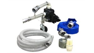 The pump has plastic intake and outlet fittings, with 50′ discharge and 25′ suction hoses with cam lock fittings. A foot valve/strainer combo and steel strainer are also included with the unit. The foot valve has a screen around the foot to keep out larger debris, and prevents drain back to maintain constant priming. It also has a caster wheel for easy maneuverability.