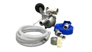 The attachment includes 2’’ suction and discharge hoses, which are 25’ and 50’ long, respectively. Both hoses have aluminum camlock fittings, and one extra camlock fitting is included with the discharge hose. The pump is also fitted with a caster wheel for easy maneuverability.