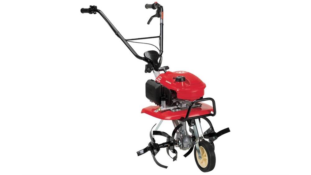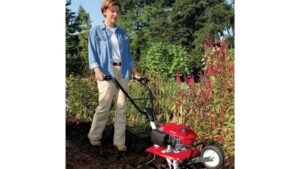 - Easy-to-raise, retractable transport wheel: A convenient transport wheel swings up to a locked position for tilling. No tools needed!