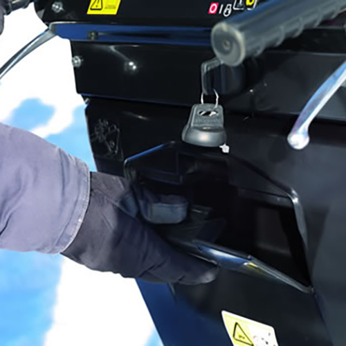 - Operator’s essentials kept handy.: Just under the control panel, a large box holds the operator’s manual and tools for easy access and simple storage.
